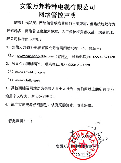 鄭重聲明:安徽萬邦特種電纜有限公司官方網站為:www_wanbangcable_com.888881.net,除此之外無任何子網站或合作網站,其余均為假冒偽劣。電話:0550-7621728 13485756353 地 址:安徽省天長市滁州高新技術產業開發區經四路29號